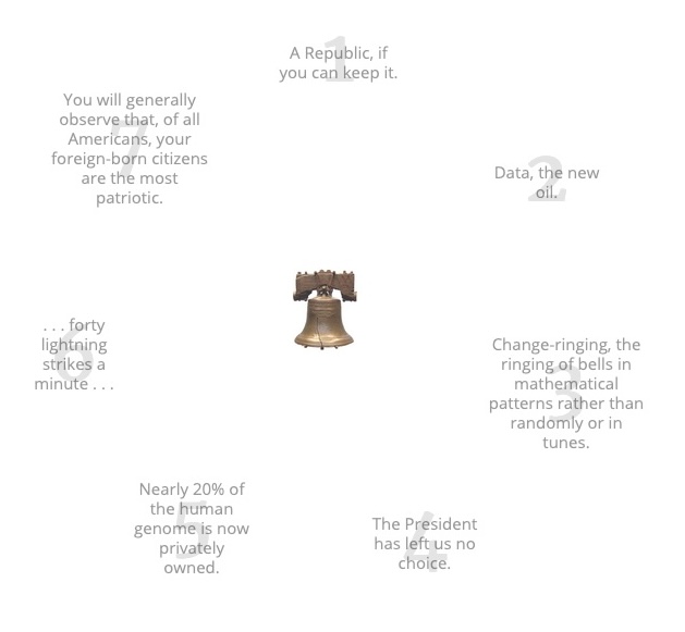 Each bell in Liberty Ring!, an interactive companion piece to Stephanie Strickland's poetry collection Ringing the Changes, has its own set of 11 texts. These quotation fragments are sourced from The Framers, Frederick Douglass, Herman Melville, and Sojourner Truth, among others.